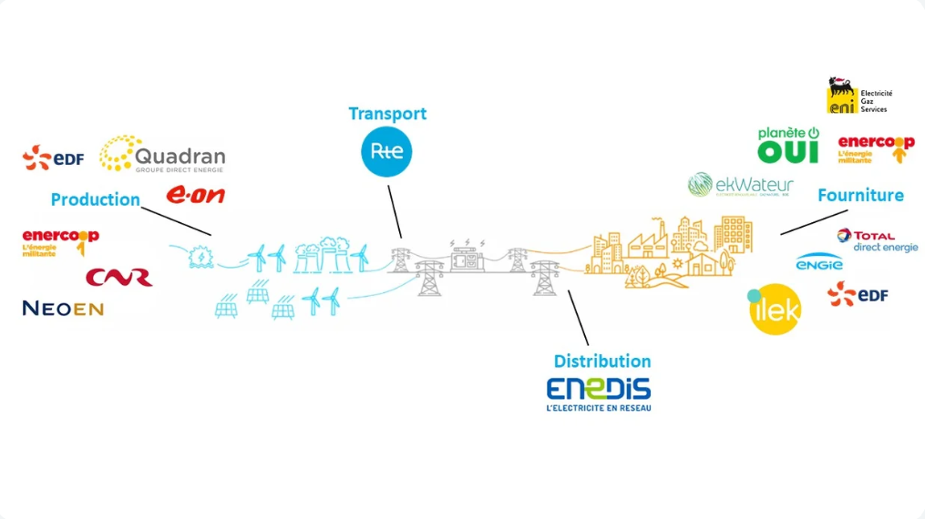 Dans un premier temps, des mesures ont été prises pour séparer la production, le transport, la distribution et la fourniture d’électricité, afin de favoriser la concurrence et empêcher les monopoles. EDF, qui détenait le monopole sur l’ensemble de la chaîne de valeur, a dû se diviser en plusieurs entités distinctes, dont EDF Énergies Nouvelles pour les énergies renouvelables, ou RTE et Enedis pour la gestion du réseau de transport d’électricité. En parallèle, de nouvelles entreprises ont été autorisées à entrer sur le marché français de la production et de la fourniture d’électricité. Les consommateurs français ont donc eu la possibilité de choisir leur fournisseur d’électricité.