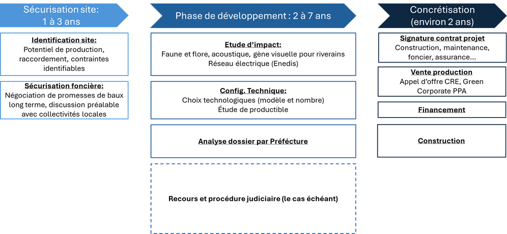 Un projet EnR découle donc d’un process long, coûteux et risqué pouvant s’arrêter à chaque instant. Chaque étape de ce processus requiert une expertise spécifique et une coordination étroite entre les différents acteurs impliqués (bureau d’étude, porteur de projet, financeur, fournisseur d’éoliennes et de panneaux solaires, Enedis…). La réussite dépend non seulement de sa viabilité technique et économique mais également de son acceptation par les communautés locales et de son intégration harmonieuse dans l’environnement.